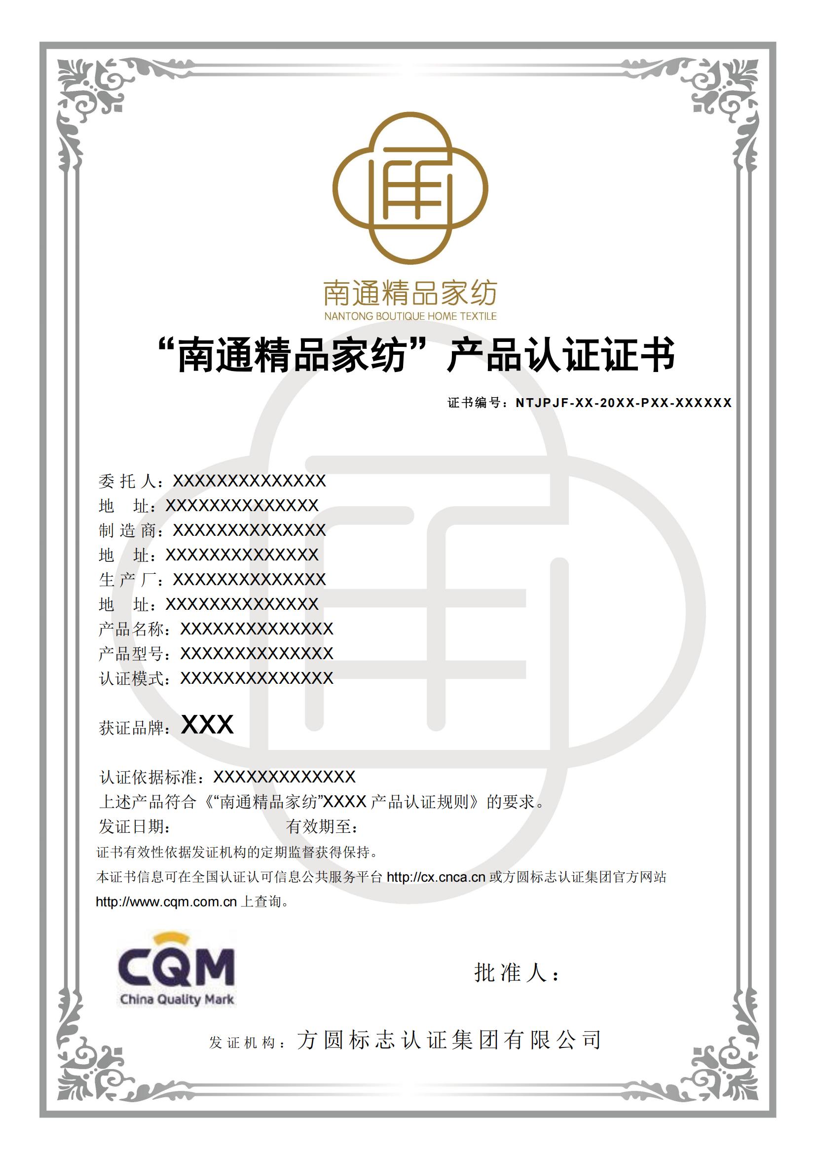 2.“南通精品”证书样式: