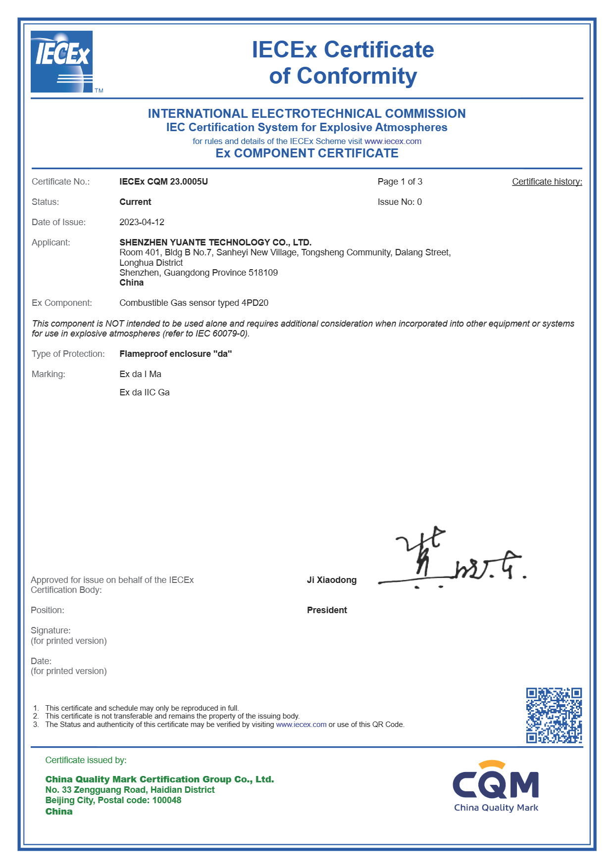4月19日,九游平台_九游(中国)为深圳市元特科技有限公司自主研发和生产的可燃性气体传感器颁发了IECEx认证证书,这是中国加入IECEx设备认证体系以来,中国机构为适用于0区、EPL Ga的隔爆型可燃性气体传感器的首张IECEx证书。