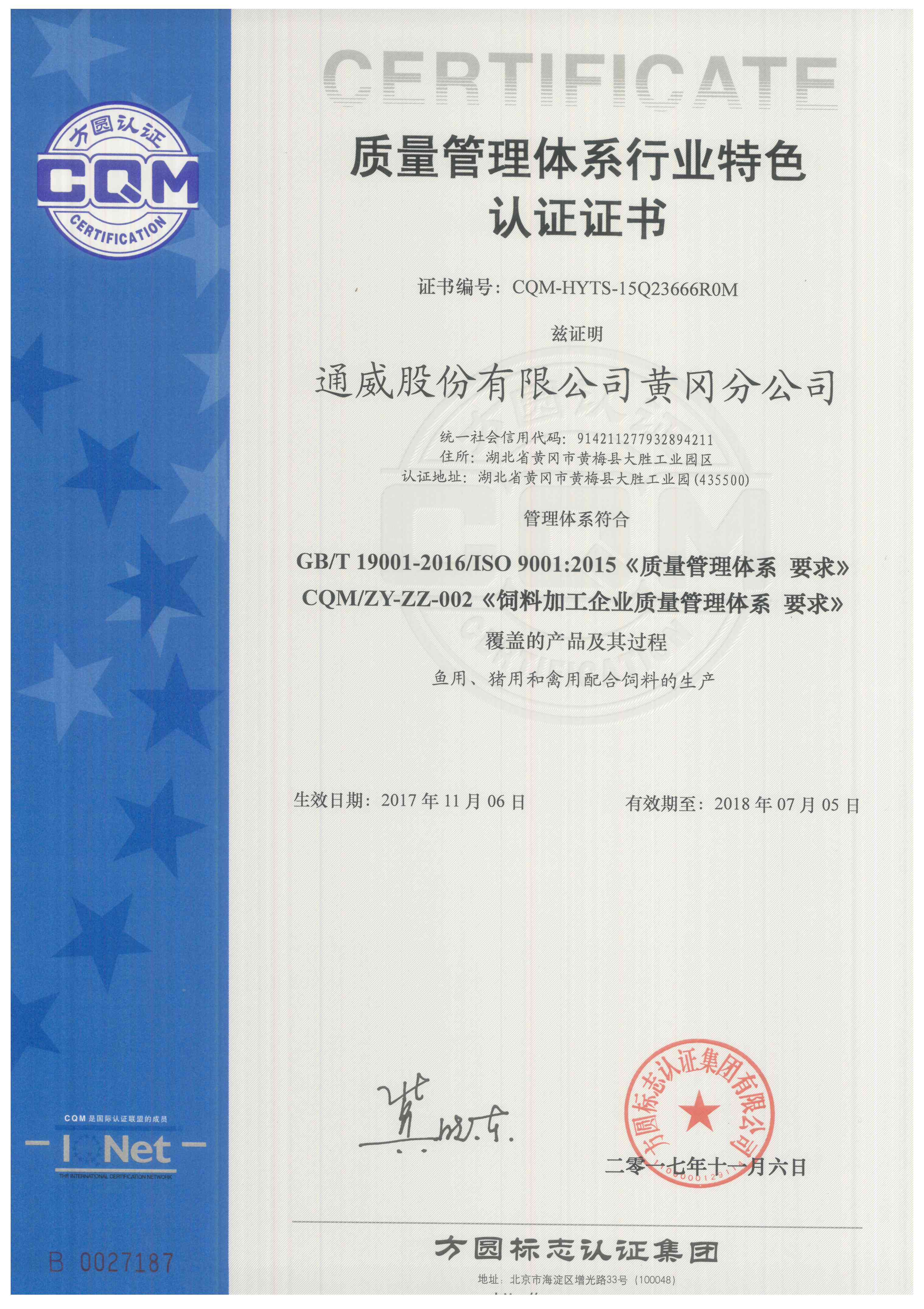 通威黄冈分公司是国内最大的水产饲料及重要的畜禽饲料生产企业——通威股份有限公司的全资分公司。该公司根据《饲料质量安全管理规范》、GB/T19001-2016《质量管理体系 要求》,制订和完善了《质量安全管理手册》、《程序文件》和《饲料质量安全管理制度》;积极进行了内部审核和管理评审工作。
