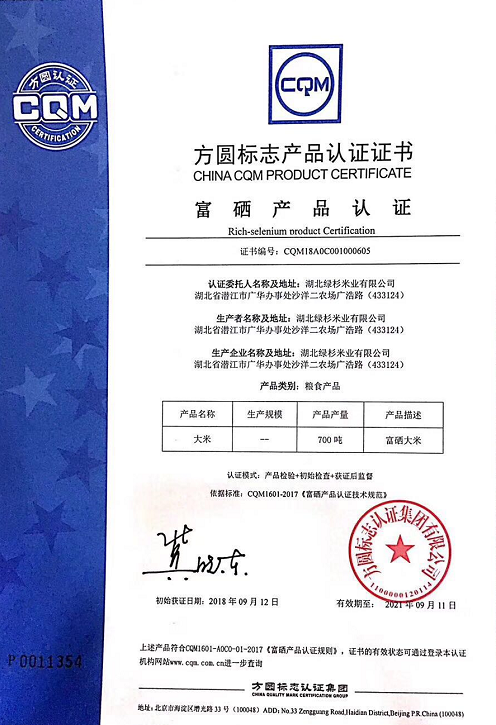 获证企业湖北绿杉米业有限公司隶属于沙洋监狱局湖北沙洋广华农工贸有限公司,种植基地位于“鱼米之乡”富硒聚集地江汉平原腹地,是方圆集团的优质客户,通过了方圆质量、环境、职业健康安全管理体系认证,富硒大米的原材料水稻也通过了方圆良好农业规范一级认证。