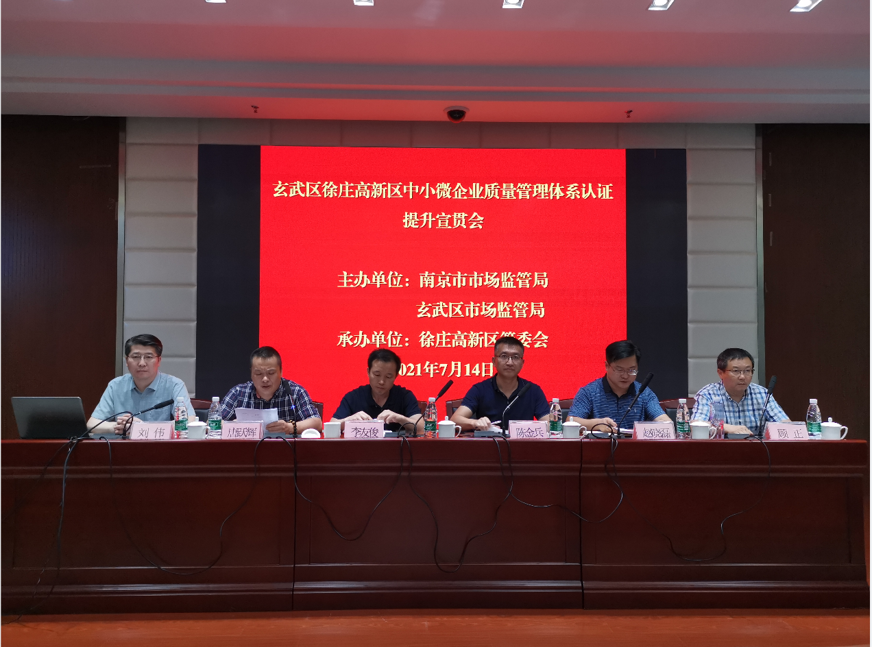 7月14日,由南京市市场监督管理局、玄武区市场监督管理局主办,徐庄高新区管委会承办的玄武区小微企业质量管理体系认证提升行动宣贯会在南京市玄武区顺利召开。南京市市场监督管理局认证监督管理处副处长陈金兵、徐庄高新区管委会经济发展部副部长赵晓磊、玄武区市场监督管理局副局长李友俊出席会议并讲话,南京市局、玄武区局相关领导及徐庄高新区内有质量提升意愿的中小微企业代表共计50余人参加了本次宣贯会。会议由南京市市场监督管理局一级主任科员唐跃辉主持,方圆标志认证集团江苏有限公司常务副总经理刘伟率相关技术专家应邀参会。