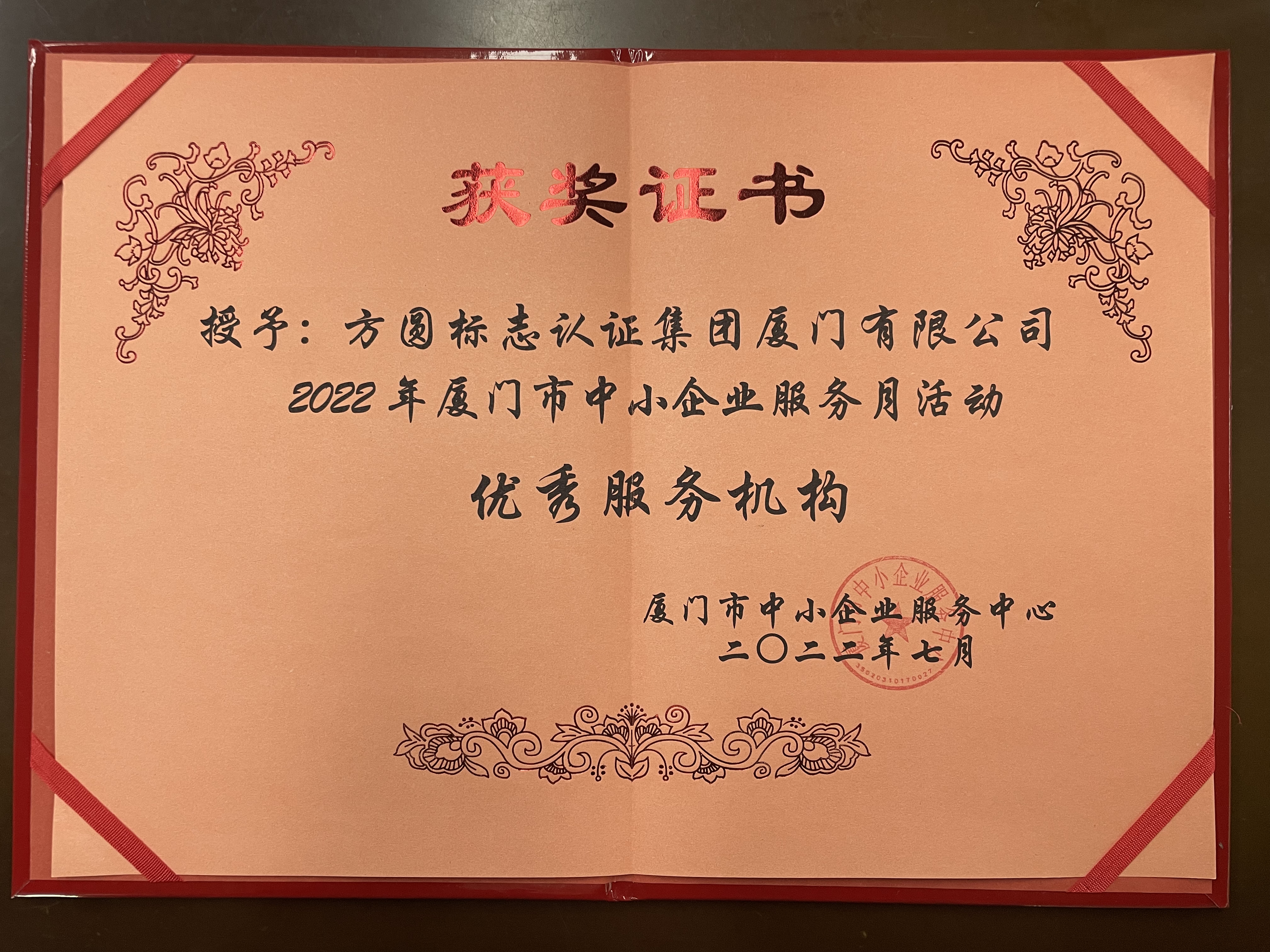 7月15日, 厦门市中小企业服务中心召开2022年厦门中小企业服务月活动总结座谈会,会上授予方圆标志认证集团厦门有限公司2022年厦门市中小企业服务月活动“优秀服务机构”荣誉称号。