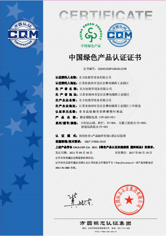 时间:2022年10月18日 近日,东方娃教学设备有限公司、江苏宝乐实业有限公司在扬州市场监管局的指导和宝应市场监管局的支持下,在方圆江苏公司的帮扶提升下,顺利通过中国绿色产品认证并获得认证证书,这是方圆江苏公司首次结合绿色产品认证开展小微企业质量提升活动的特色创新帮扶。